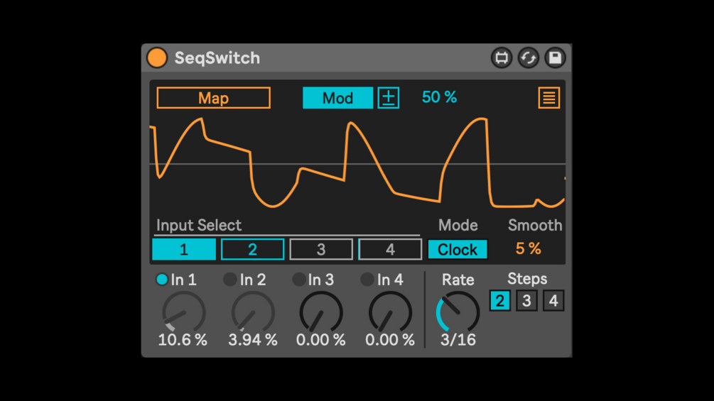 Eurorack-inspired sequential switch: send one of four modulation sources to a single destination, with both manual and clock-synced switching.
